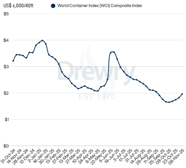 Drewry世界集装箱运价指数WCI本周上涨8%