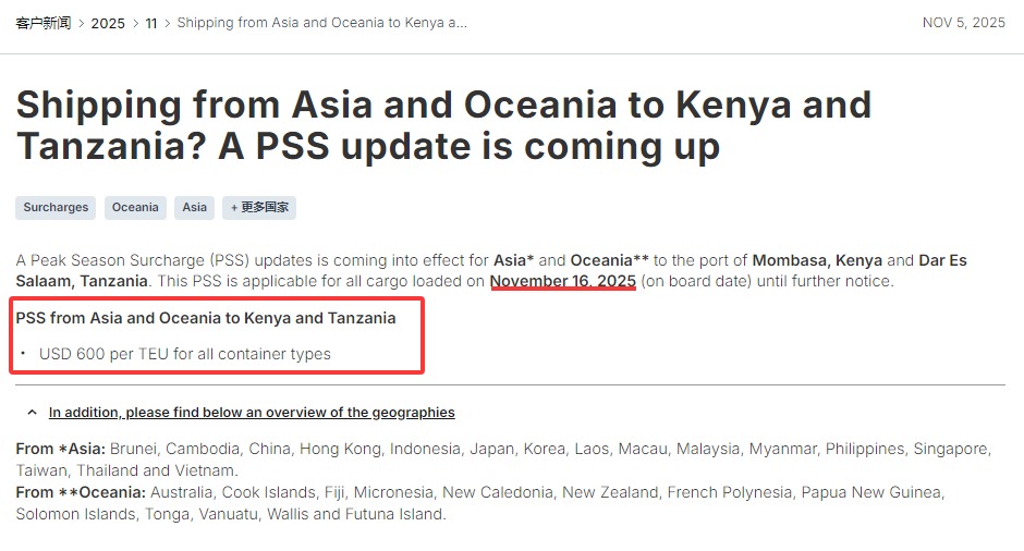 赫伯罗特:从亚洲和大洋洲运送到肯尼亚和坦桑尼亚征收PSS