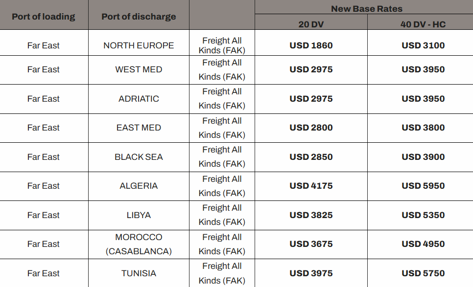 MSC宣布,自2025年12月1日起(直至另行通知),从远东港口(含日本、韩国及东南亚各港口)至北欧、地中海(含西地中海、东地中海、亚得里亚海及北非)、黑海等目的地新订舱实施全新统一费率(FAK):