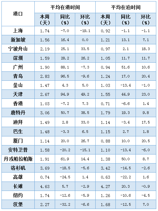 受季节变化大风影响,中国部分沿海港口作业效率有所下降,国际集装箱船舶平均在港、在泊时间分别为1.76天和0.99天,较上周分别上升8.6%和12.5%。