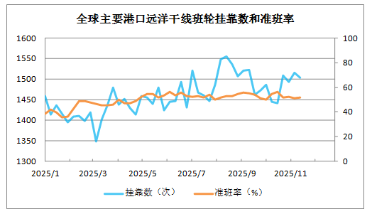 50大基本港的全球主干航线集装箱班轮收发货服务合计挂靠数为766艘次,较上周减少21艘次;收发货服务准班率为46.48%,较上周下降0.67个百分点。