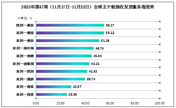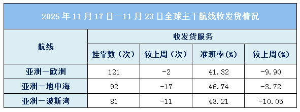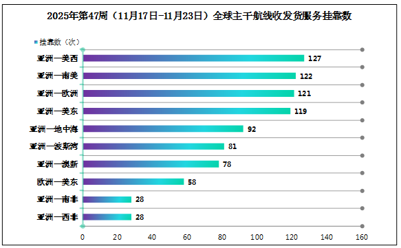 全球主干航线收发货服务挂靠数排名前三的航线分别为亚洲—美西航线、亚洲—南美航线和亚洲—欧洲航线。其中,亚洲—美西航线排名第一,挂靠数为127艘次,较上周增加5艘次。亚洲—南美航线挂靠数排名第二,挂靠数为122艘次,较上周减少20艘次;准班率为45.08%,较上周下降5.62个百分点。亚洲—欧洲航线挂靠数排名第三,挂靠数为121艘次,较上周减少2艘次。