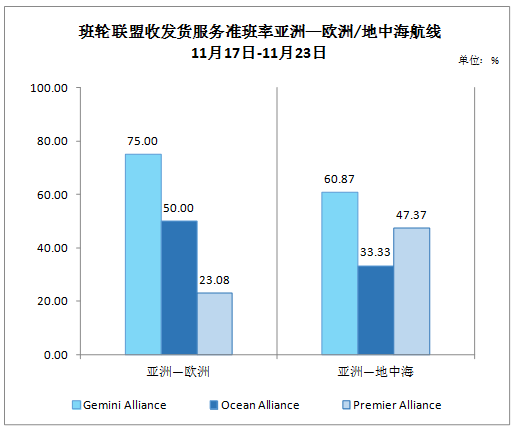 在欧线上,双子星盟班轮准班率排名第一,为75.00%。