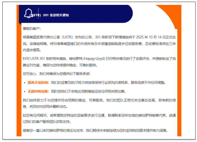 近日,随着美国港口费措施将于2025年10月14日开始实施的临近,赫伯罗特、HMM也针对美国USTR关于301条款服务费发布相关通知。