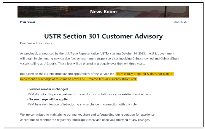 9月26日,HMM发布美国USTR 301客户咨询。已经做好了充分的准备,目前不打算实施附加费,同时服务保持不变。
