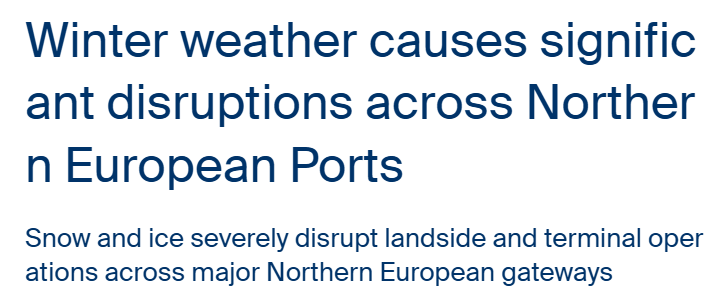 近日,北欧及西欧大范围地区遭遇恶劣冬季天气,港口及内陆运输作业持续受到严重影响。