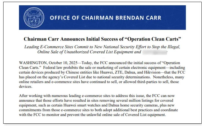 据外媒最新消息,近日,美国联邦通信委员会(FCC)以所谓“国家安全风险”为由,宣布强制美国各大在线电商平台下架数百万件中国电子产品,这一行动被称为“清洁购物车行动”Operation Clean Cart)。