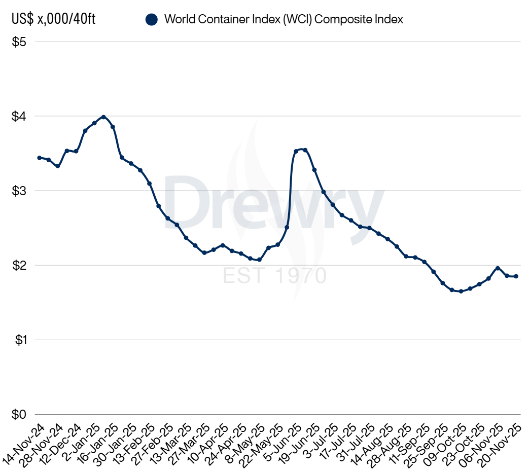 截至11月21日,上海出口集装箱综合运价指数(SCFI)为1393.56点,较上期下跌约4.0%。