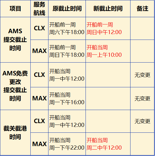 1月14日,美森轮船公告,对宁波CLX / MAX出口航线的 AMS 提交截止时间及 MAX 截关时间进行延后调整。