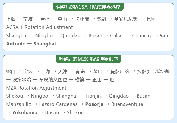 在车厘子快线服务期间,ACSA 1与M2X两条航线的港口挂靠顺序将作如下临时调整,敬请留意:
