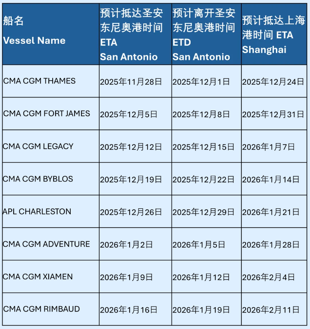 车厘子快线服务将在圣安东尼奥港特设8个固定班次,具体船期如下: