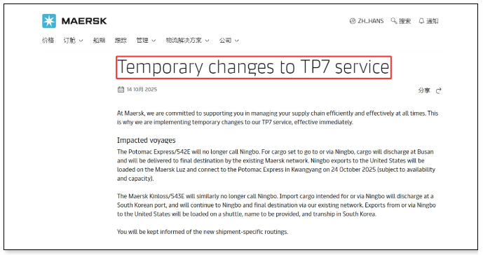 根据安排,集装箱船“Potomac Express”的542E航次不再停靠宁波。对于前往宁波或经宁波的货物,货物将在韩国釜山港卸货,并通过现有的马士基网络运送到最终目的地。宁波出口到美国的货物将于2025年10月24日“由Maersk Luz”号装载,并在韩国光阳港与“Potomac Express”衔接。