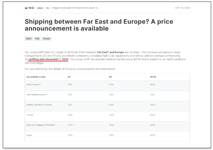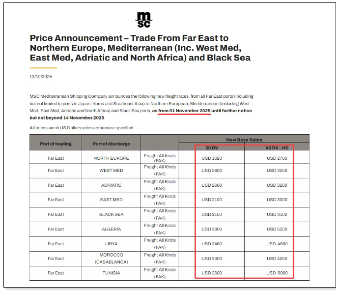MSC地中海航运宣布以下新运价,从所有远东港口(包括但不限于日本,韩国和东南亚港口)到北欧、地中海(包括西地中海,东地中海,亚得里亚海和北非)和黑海港口,自2025年11月1日起至另行通知,但不超过2025年11月14日。详情如下: