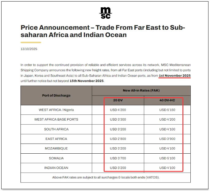 MSC地中海航运宣布以下新运价,从所有远东港口(包括但不限于日本,韩国和东南亚港口)到所有撒哈拉以南非洲和印度洋港口,从2025年11月1日起直至另行通知,但不超过2025年11月15日。详情如下: