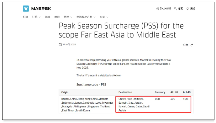 马士基宣布,将调整征收从远东亚洲至中东的旺季附加费PPS,生效日期为2025年11月1日。征收300美金。详情如下: