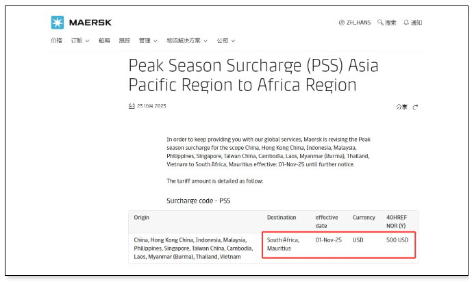 马士基宣布,将调整征收中国,中国香港,中国台湾,印度尼西亚,马来西亚,菲律宾,新加坡,柬埔寨,老挝,缅甸,泰国,越南到南非,毛里求斯的旺季附加费PSS,生效日期:2025年11月1日,直至另行通知。详情如下: