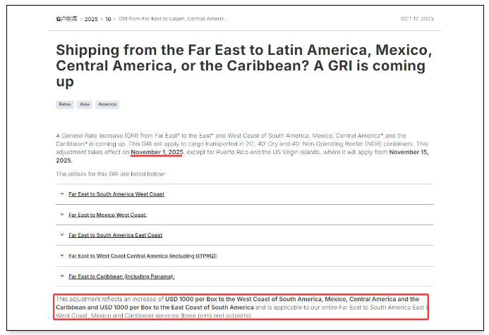 赫伯罗特宣布,将调整征收远东至南美西、南美东、墨西哥、中美洲和加勒比海的GRI费率。2025年11月1日生效。此调整每个集装箱增加1000美元。