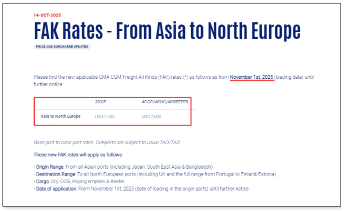 达飞宣布,从亚洲到北欧2025年11月1日起适用的新的FAK费率。详情如下: