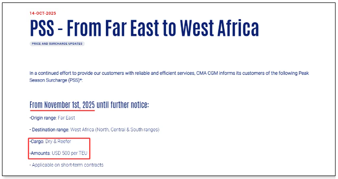 达飞宣布,从远东到西非征收旺季附加费PSS,自2025年11月1日起,直至另行通知。详情如下: