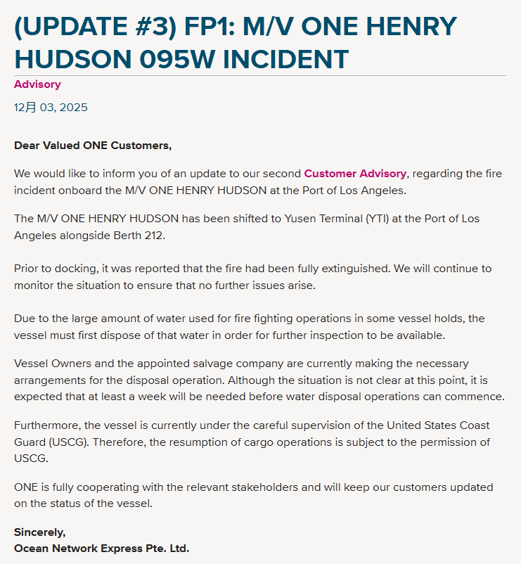 “M/V ONE HENRY HUDSON” 已经被转移到洛杉矶港的Yusen Terminal(YTI)并停靠在212号泊位。在靠泊之前,据报道,火灾已被完全扑灭。