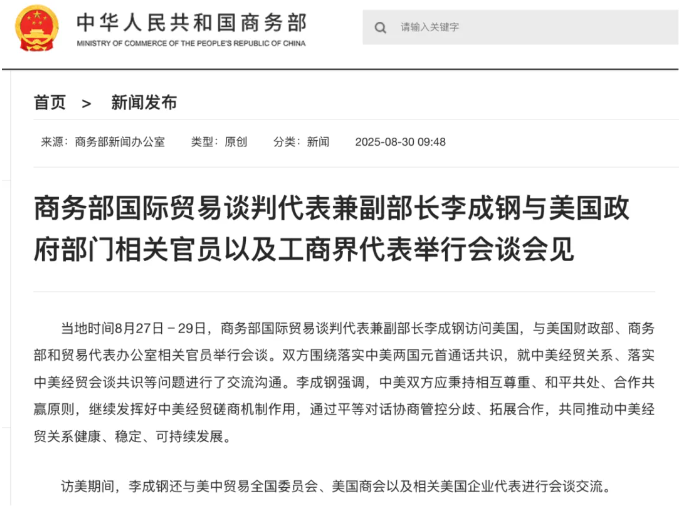 当地时间8月27日—29日,商务部国际贸易谈判代表兼副部长李成钢访问美国,与美国财政部、商务部和贸易代表办公室相关官员举行会谈。双方围绕落实中美两国元首通话共识,就中美经贸关系、落实中美经贸会谈共识等问题进行了交流沟通。