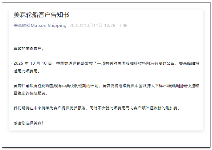 美森表示,中国交通运输部发布了一项有关对美国船舶征收特别港务费的公告,美森船舶将适用此项费用。同时,美森目前没有任何调整现有中美快航班期的计划。