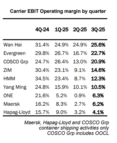 在集装箱航运市场整体从高位回落的大背景下,中国力量依然耀眼。最新一期Alphaliner 统计的行业周报显示,在2025年第三季度全球主要班轮公司的运营利润率(EBIT margin)排行榜中,来自中国(包括中国台湾地区)的三家集运公司——万海、长荣海运和中远海运集团——包揽前三名,远远领先于其他国际同行。中国“三大航运公司”在本轮盈利榜单中形成了明显的“第一梯队”。