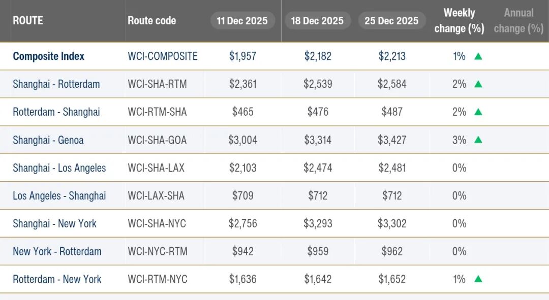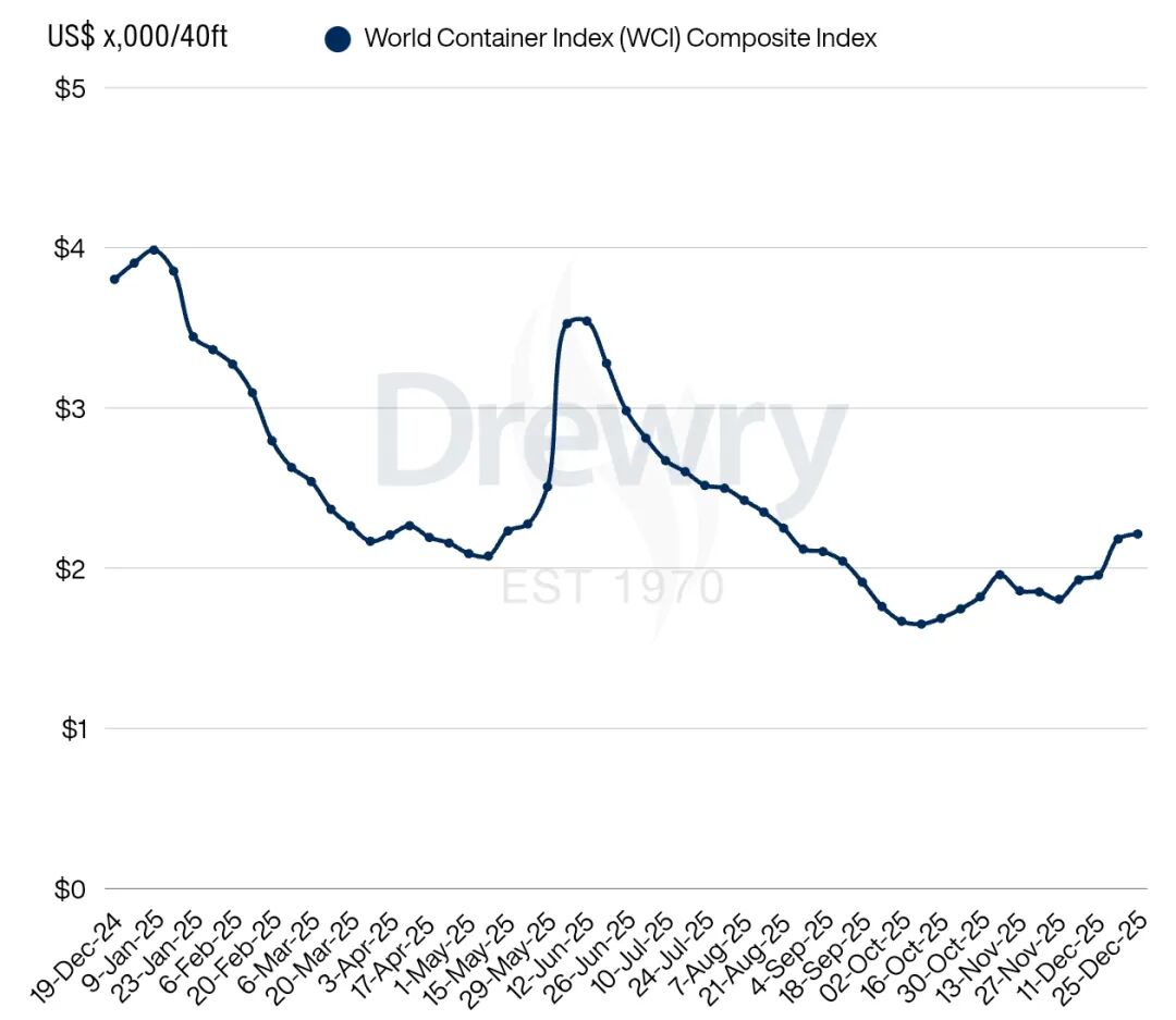 截至上周(12月25日),Drewry世界集装箱运价指数(WCI)为2,213美元/FEU,上涨31美元,涨幅1%,实现“四连涨”。