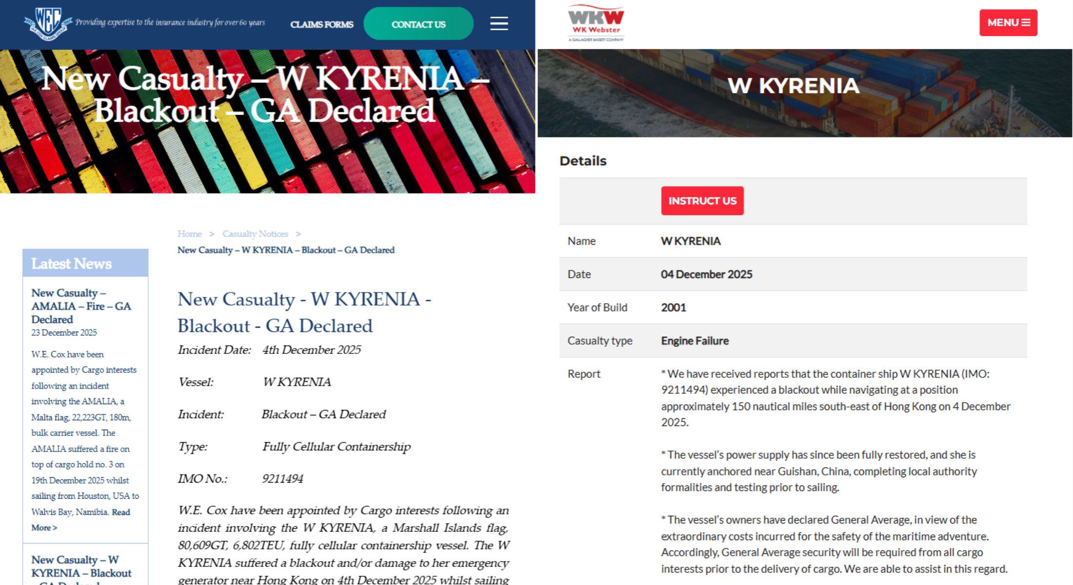 2025年12月4日,马士基运营的“W KYRENIA”号集装箱船在航行途中发生断电及应急发电机损坏事故致巨额损失,保险理赔公司通知称船东已启动共同海损GA程序,货主须在货物交付前提供共同海损担保,目前保险公司正受托调查,船东已指定GA理算人与收款代理人,该船仍将继续完成其预定航程。