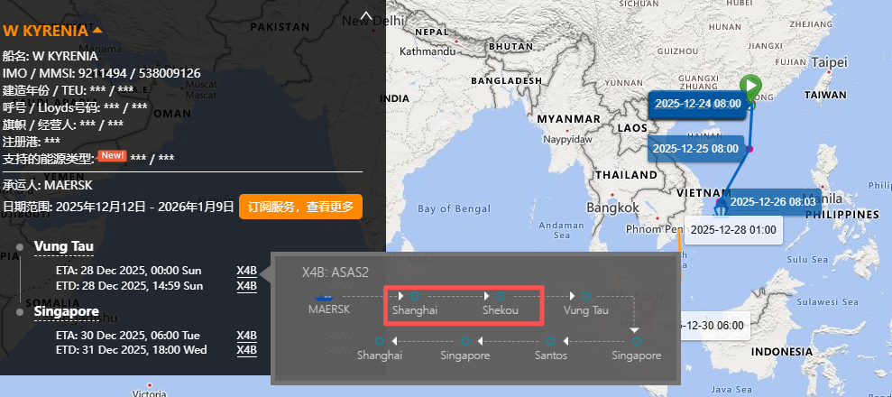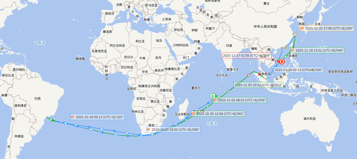 2025年12月4日,悬挂马绍尔群岛国旗的全集装箱船“W KYRENIA”号(IMO编号:9211494)在从亚洲多个港口(12月1日-3日曾挂靠上海洋山港)驶往南美洲巴西桑托斯港的途中,于香港东南约150海里处(香港附近)航行时发生断电情况,同时应急发电机也出现损坏。该船总吨位80,609吨,运力6,802标准箱。