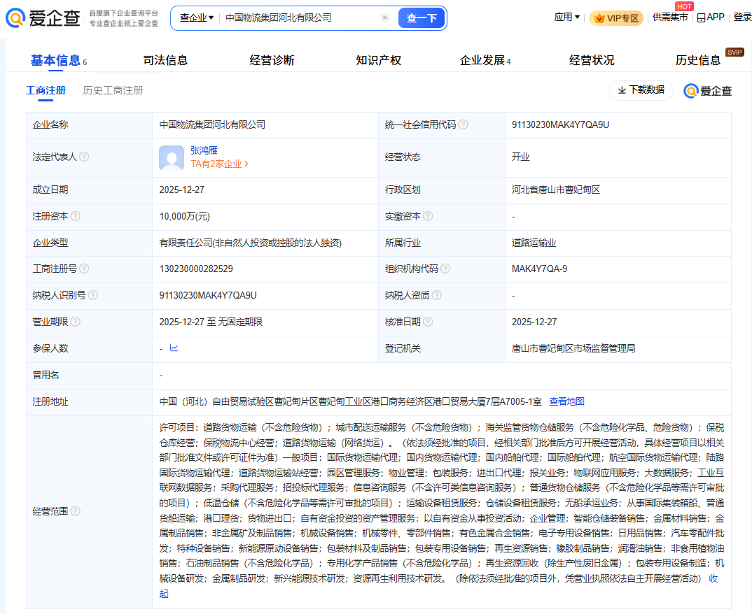 爱企查信息显示,2025年12月27日,中国物流集团河北有限公司正式成立,由中国物流集团全资持股,注册资本1亿元,张鸿雁担任法定代表人、董事长。