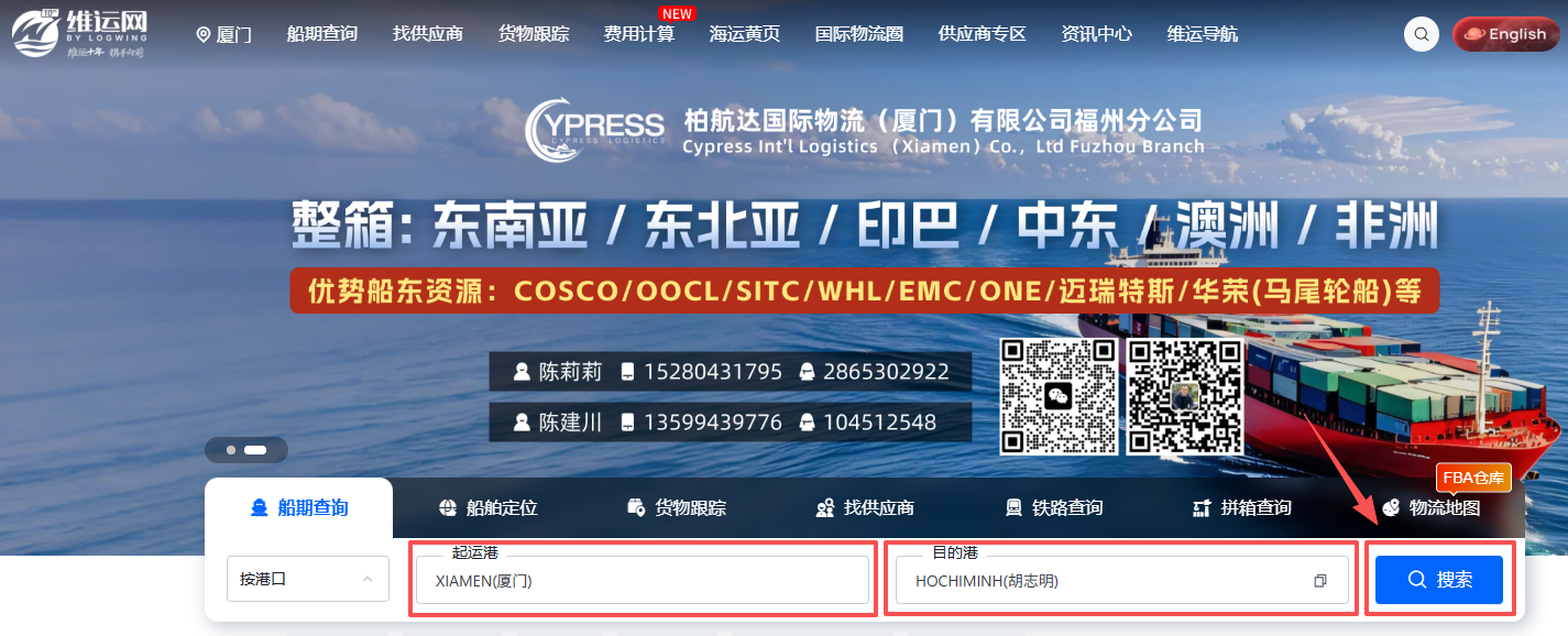 首先,打开维运网官网,找到【船期查询】页面,输入您想查询的航线后点击【搜索】。