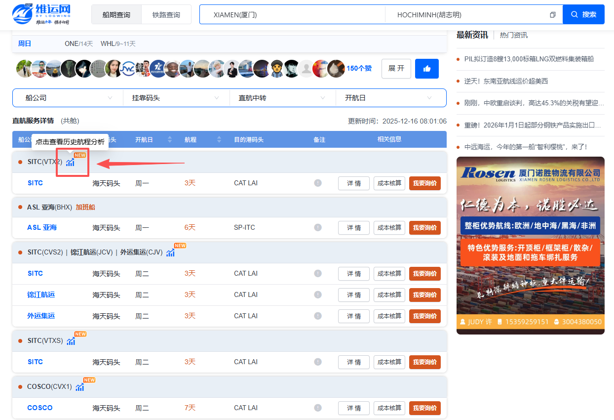 通过维运网船期查询页的