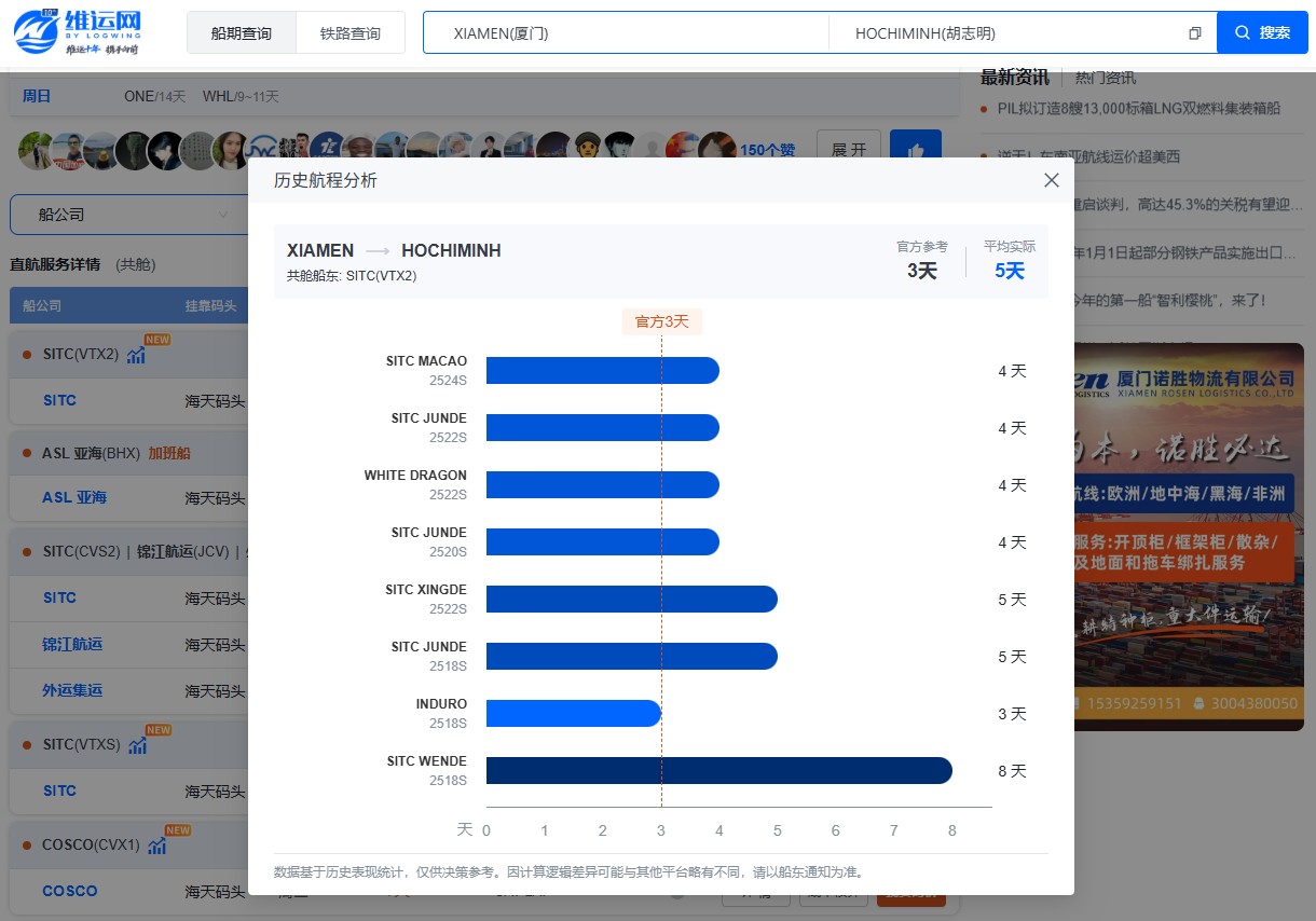 点击图标即可查看该航线多条历史船次的真实航程数据与波动分析(加班船除外)。