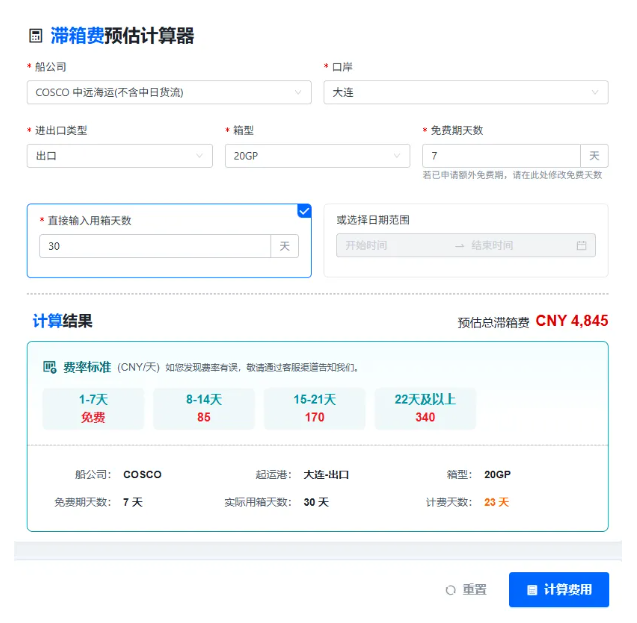 自定义免费期:和船公司谈好的特殊免费天数,直接输入就行,告别“按标准算不准”的麻烦。