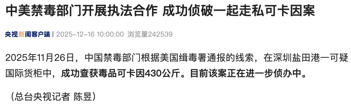 据央视新闻昨日消息,2025年11月26日,中国禁毒部门根据美国缉毒署通报的线索,在深圳盐田港一可疑国际货柜中,成功查获毒品可卡因430公斤。