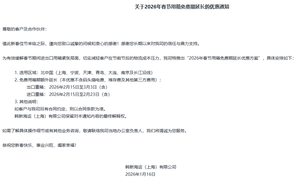不限集装箱箱型,装船出发日期在2026年2月6日至2月23日之间的货物,即适用免箱期额外延长服务。