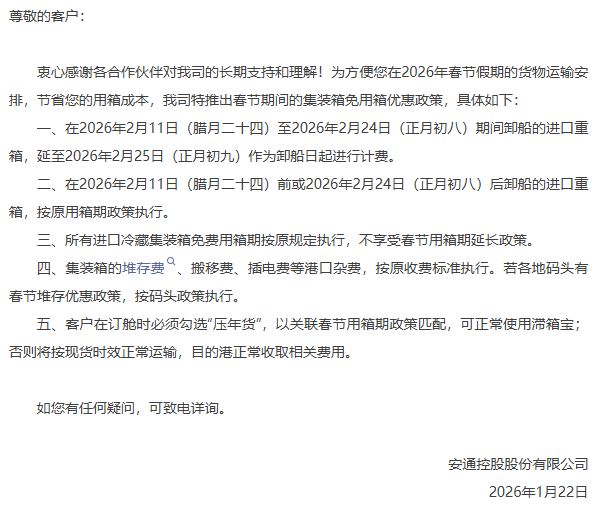 仅针对进口重箱,安通控股推出特别免箱期政策。