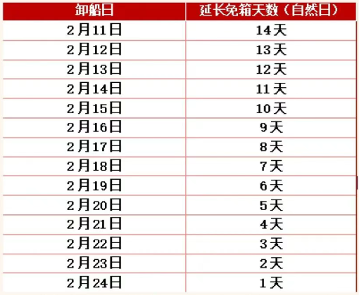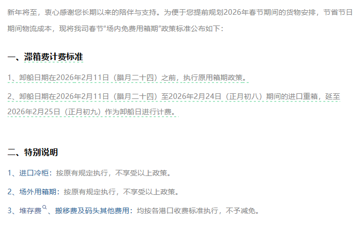 即在2026年2月11日至2月24日期间卸船的进口重箱,计费起始日延长至2月25日。