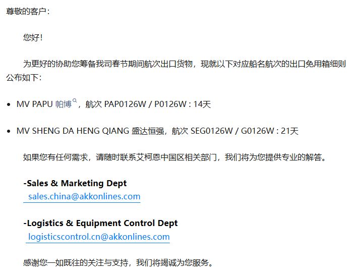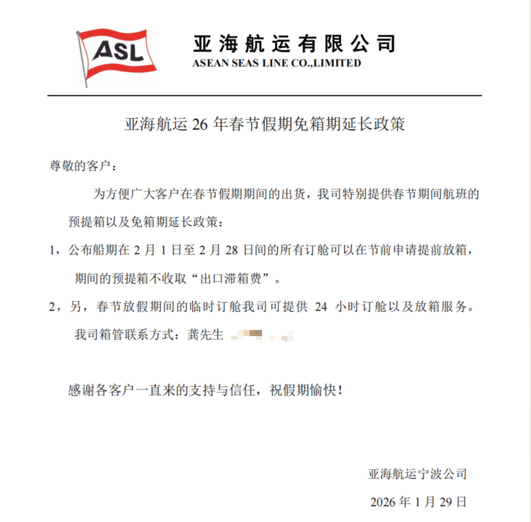 所有在2月1日至2月28日期间的订舱可以在节前申请提前放箱,期间的预提箱不收取“出口滞箱费”。