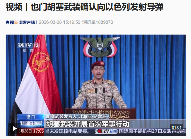 据央视新闻,胡塞武装当地时间3月28日发表声明称,为回应当前地区局势升级,以及针对黎巴嫩、伊朗、伊拉克和巴勒斯坦相关目标的军事行动,该组织已开展军事行动,使用多枚弹道导弹,打击了以色列“重要军事目标”。