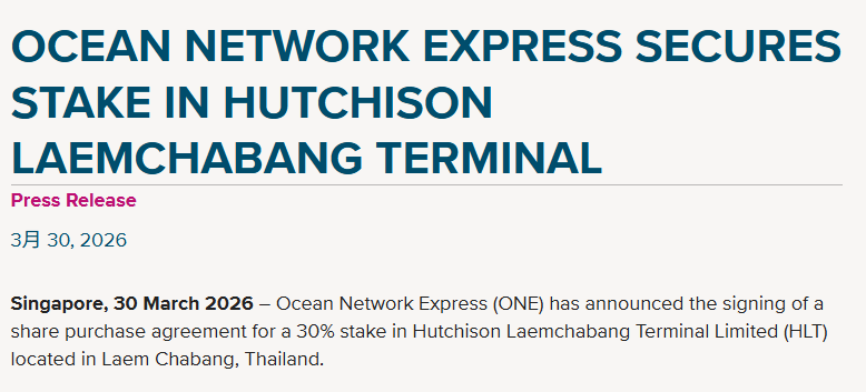 3月30日,海洋网联船务(ONE)宣布,与和记港口集团有限公司(简称和记港口)签署股份购买协议,收购和记港口旗下林查班码头有限公司(HLT)30%的股权。本次收购还需满足监管机构的审批。